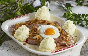 Disponha os bifes numa travessa e, por cima destes, a cebolada e os ovos estrelados. Coloque o puré de batata num saco pasteleiro e faça rosetas ao lado dos bifes. Sirva de seguida.