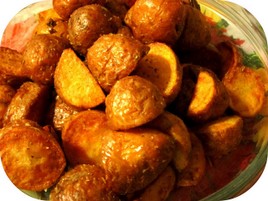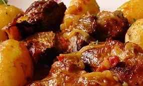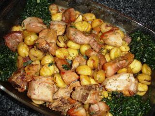 Lavei as batatinhas com a pele e cozi-as em água temperada com sal. Escorri-as, retirei-lhes a pele e juntei-as à entremeada. Envolvi no molho e deixei assar mais 15 minutos.