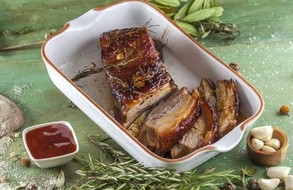 Coloque a barriga de porco num tabuleiro e faça-lhe alguns cortes na diagonal. Reserve.