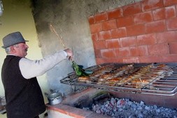Escorrer os frangos e reservar a marinada. Preparar a churrasqueira. Aquecer uma grelha, que deve ficar mais ou menos a uma distância de 4 dedos do lume.