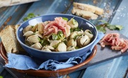 Transfira as amêijoas e o molho para um prato, polvilhe com os restantes coentros picados e as tiras de presunto e sirva de imediato.
