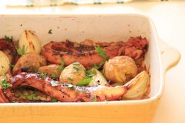Coloque depois os tentáculos num tabuleiro que posso ir ao forno e acrescente do dentes de alho laminados, duas cebolas cortadas em quartos, a malagueta. Polvilhe as cebolas com um pouco de sal, tempere com pimenta moída na hora e regue generosamente com azeite. Escorra as batatas e dê-lhes um murro leve, de modo a que abram e coloque-as também no tabuleiro. Leve ao forno previamente aquecido a 180ºC durante 30 minutos ou até as cebolas estarem douradas.