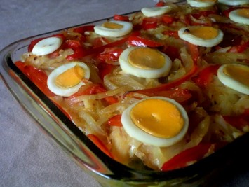 Unte um pirex e coloque-lhe dentro a cebola refogada, o bacalhau, os camarões já descascados e as amêijoas.