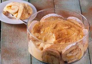 Bata as claras em castelo e envolva-as no preparado anterior. Corte a torta em fatias e disponha-as nas laterais de uma taça de servir. Coloque o creme no centro, polvilhe com canela, decore a gosto e sirva.